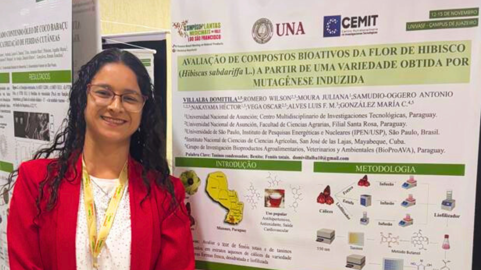 En representación del centro, la MSc. Domitila Villalba presentó en formato póster la investigación titulada: “Avaliação de compostos bioativos da flor de hibisco (Hibiscus sabdariffa L.) a partir de uma variedade obtida por mutagênese induzida” (Evaluación de compuestos bioactivos de la flor de hibisco (Hibiscus sabdariffa L.)a partir de una variedad obtenida por mutagénesis inducida). Este trabajo, desarrollado por el grupo de investigación BIOPROAVA, expone significativos hallazgos sobre las propiedades de la flor de Jamaica.