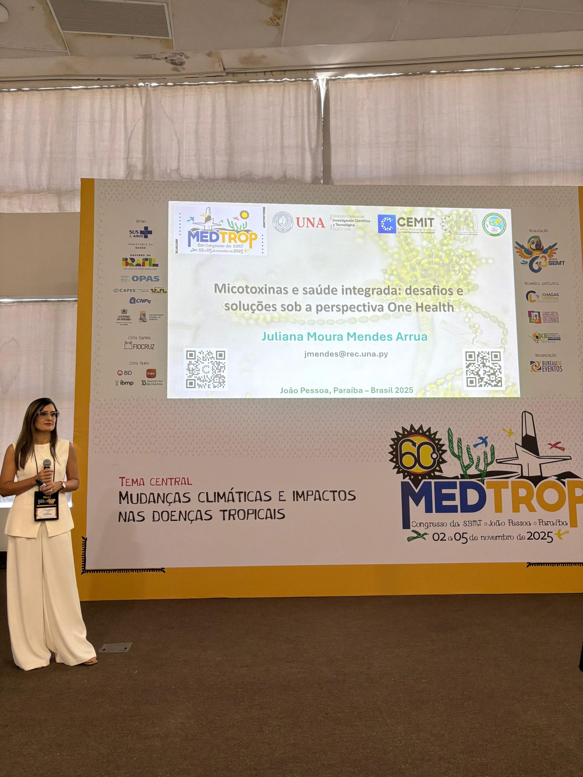 Cabe destacer que la Dra. Juliana Moura Mendes fue la única disertante invitada de Paraguay, quien brindó la conferencia titulada “Micotoxinas e saúde integrada: desafios e soluções sob a perspectiva One Health”, donde compartió la experiencia del grupo BIOPROSNAT y su significativa contribución a la investigación científica en la región.